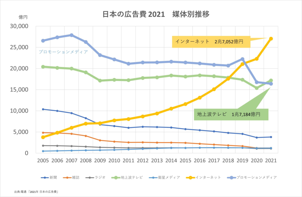 このグラフを見ると出版業界が伸びていく可能性は限りなく低い。電子書籍の伸びはあり得ると思うが、電子書籍は出版業界がいらなくなり自分で出稿できるようになる可能性が高い、と感じている。では、他のメディアはどうだろうか?